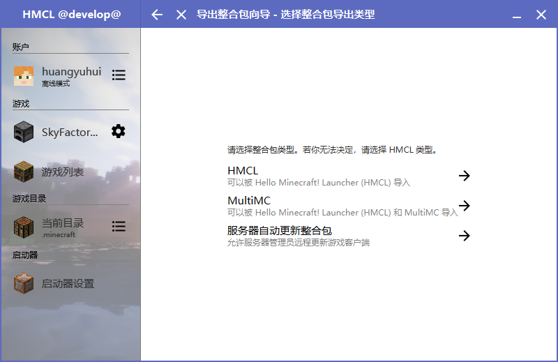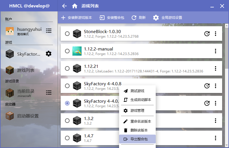 在 HMCL 中右键做好的客户端版本,选择导出整合包: