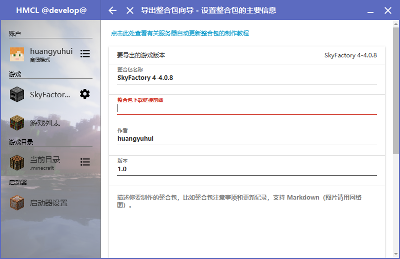 填写整合包信息,整合包下载链接前缀如何填写请看下文,你也可以先填别的(必须是个链接,比如 http://www.baidu.com),该项在整合包导出后可以修改